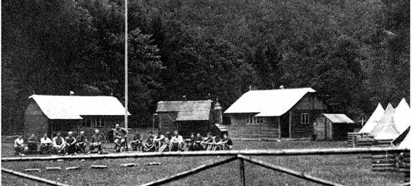 Valašská rychta se zvoničkou. Před okny rychty sedí neznámá dvojice. V budově byl (ještě před přestěhováním do Nižbora) v r. 1931 ubytován zástupce světového náčelníka Mr. Hubert Martin
